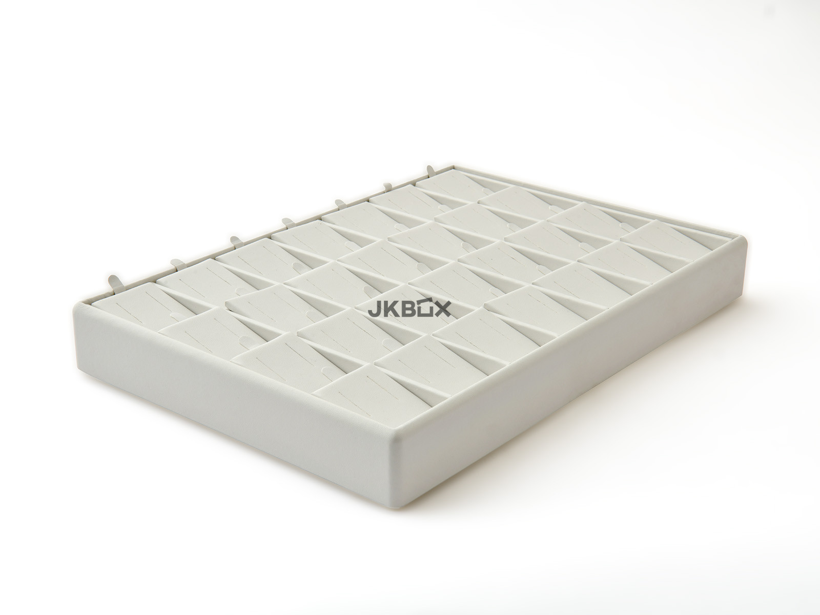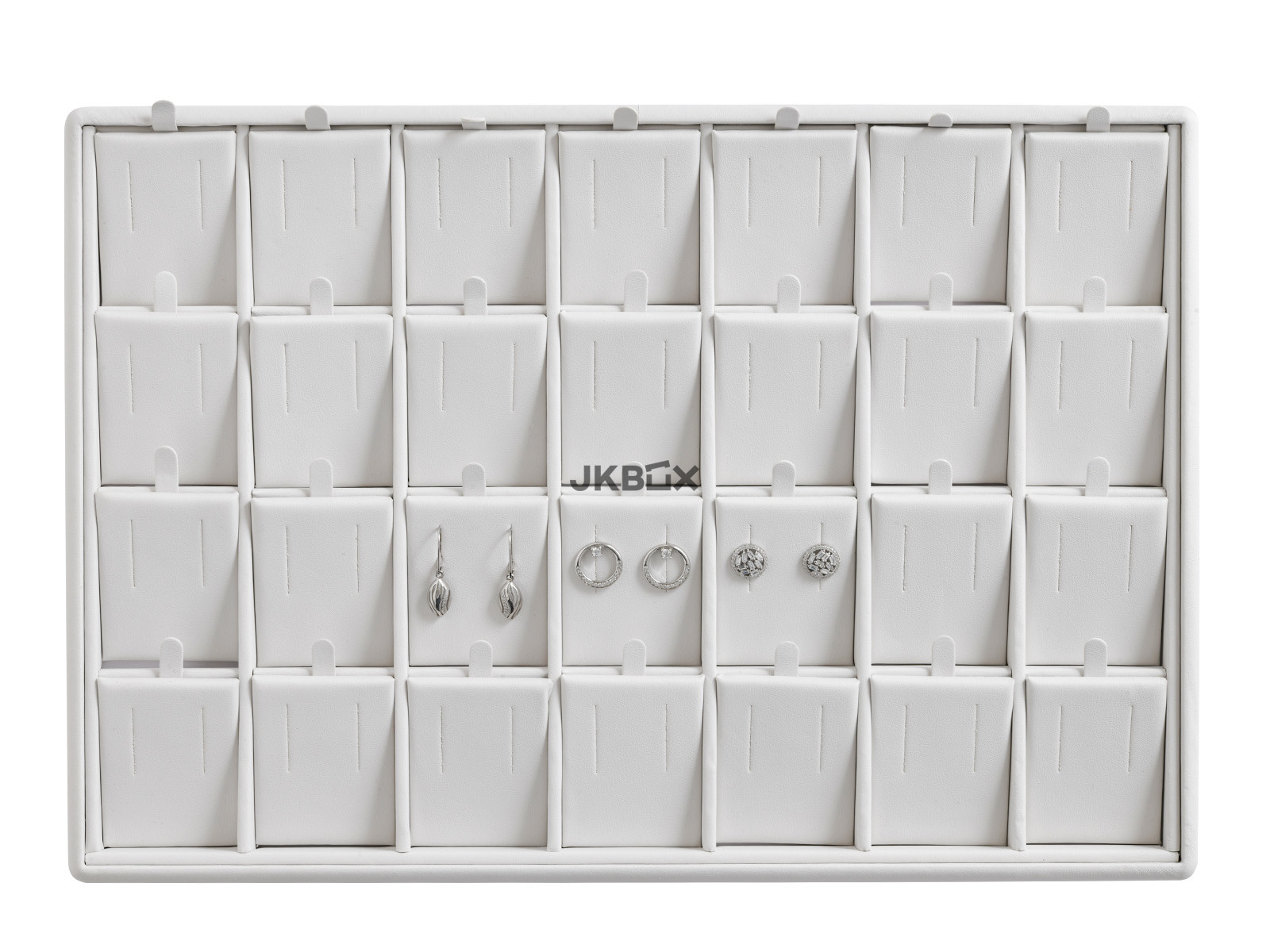TERMÉK LEÍRÁSA - Fehér ekobőr kínáló tálca 28 pár fülbevaló számára. DP-5043/A1/A1 mérete: 350x240x40 mm