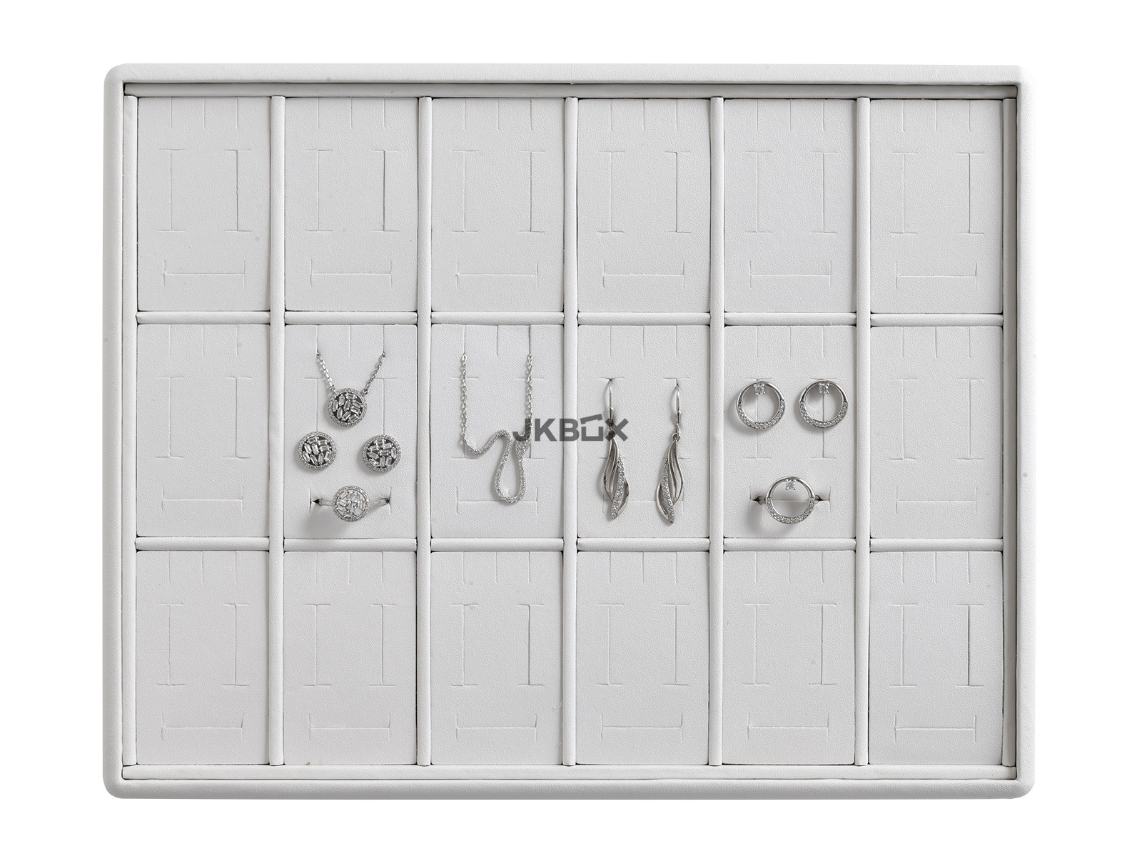 TERMÉK LEÍRÁSA - Fehér ekobőr kínáló tálca fehér belsővel, 18 db készlet számára. KT-6354/A1 mérete: 280x220x40 mm