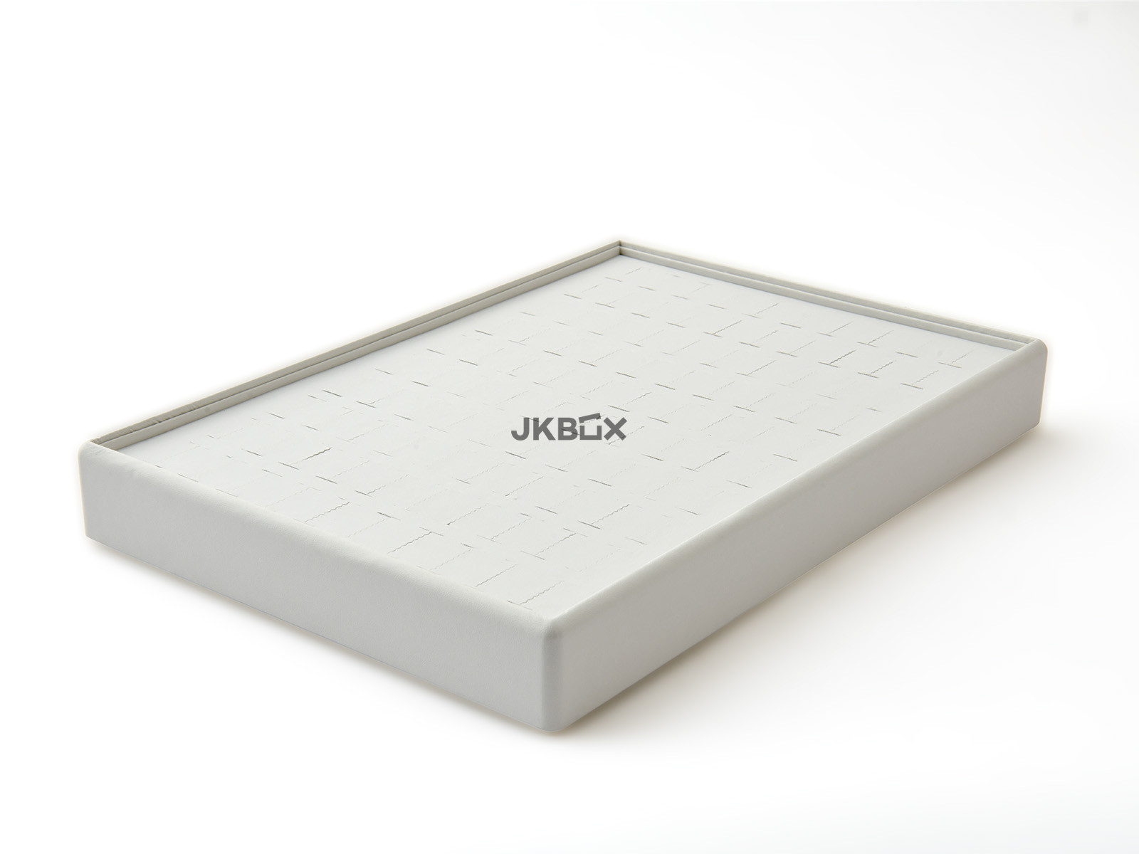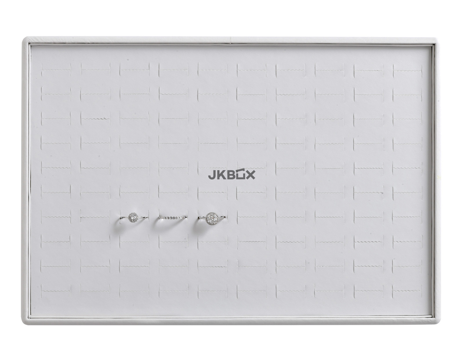 TERMÉK LEÍRÁSA - Fehér ekobőr kínáló tálca fehér belsővel, 100 pár fülbevaló vagy gyűrű számára. PF-5084/A1/F mérete: 350x240x50 mm